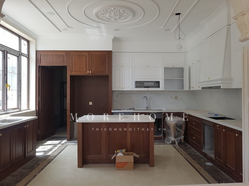 Mẫu tủ bếp chữ U được thiết kế theo hình vuông vắn, giúp sử dụng hết các góc khuất của không gian phòng bếp, tạo ra nhiều tiện ích cho gia chủ trong việc di chuyển và nấu nướng.