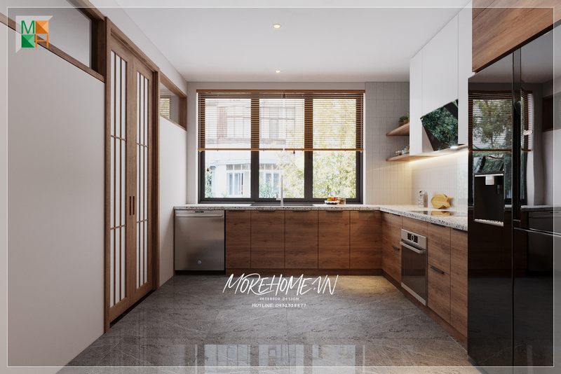 Phòng bếp nhà phố được trang trí theo phong cách hiện đại đơn giản và cung cấp nhiều tính năng hỗ trợ tốt cho việc sử dụng nấu nướng của người nội trợ.
