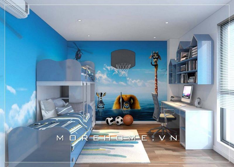 Không gian phòng ngủ của bé trai được trang trí với nội thất cá tính, và màu xanh là màu chủ đạo được gia chủ chọn lựa.